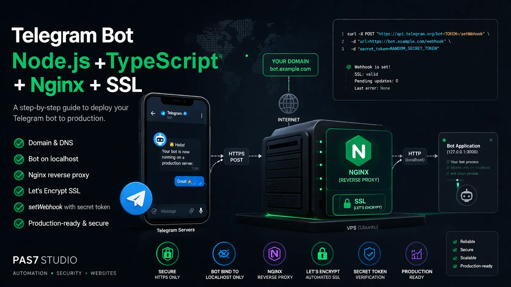 A practical 2026-ready tutorial for deploying a Telegram bot webhook on a VPS with Node.js, TypeScript, grammY, Nginx, Let's Encrypt SSL, and systemd. Includes working code, webhook registration, and production checks.